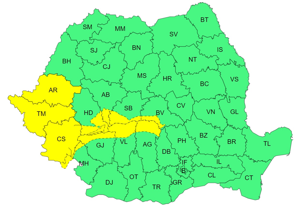 O atenţionare meteorologică cod galben va fi valabilă pentru intervalul 04 octombrie, ora 10 – 04 octombrie, ora 21, fiind prognozate intensificări ale vântului în Banat, sudul Crişanei şi în Carpaţii Meridionali, cu viteze în general de 55...65