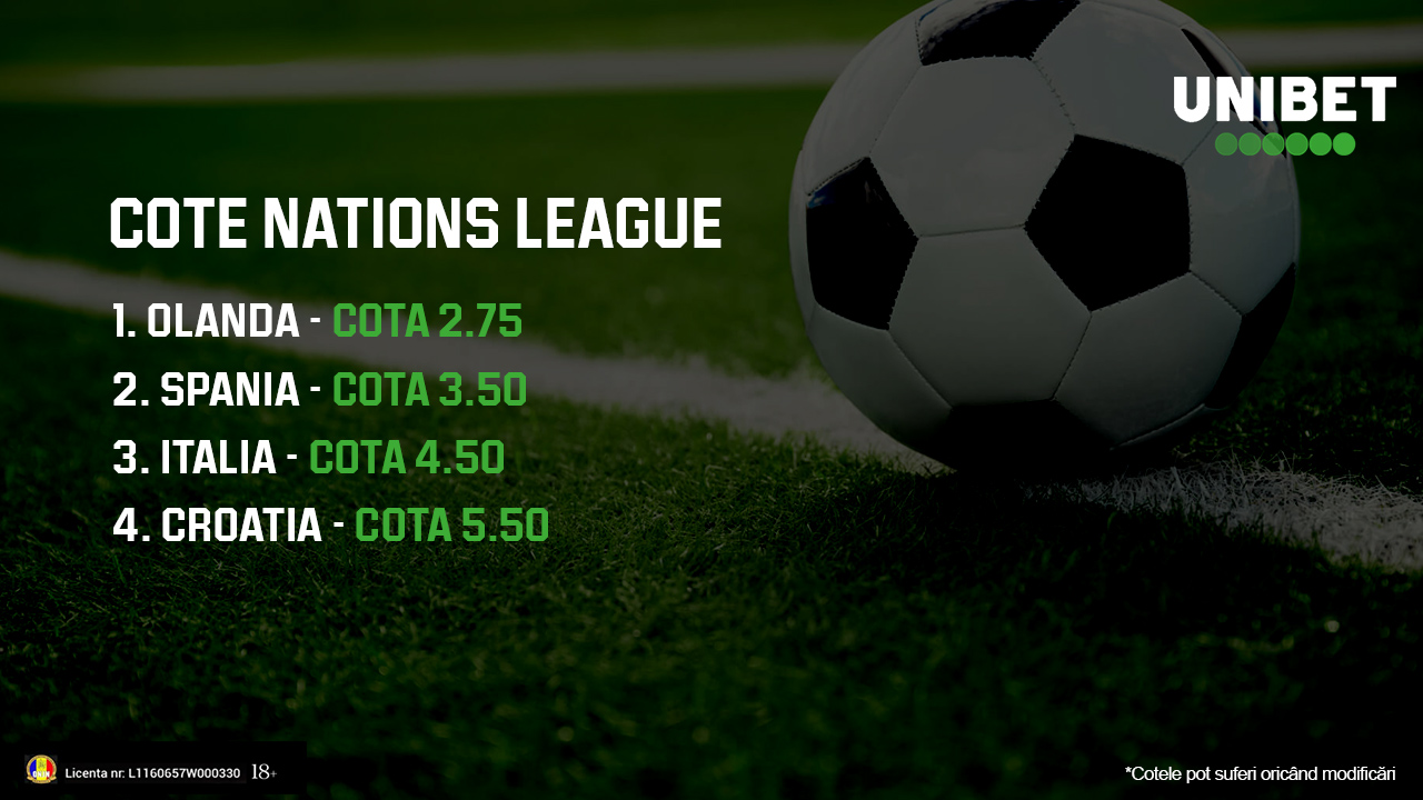 Naționala Croației pornește cu ultima șansă în oferta de pariuri Nations League. Luka Modric & co. au o cotă de 5.50 să câștige trofeul. Casele de pariuri le acordă prima șansă olandezilor, care au o cotă de 2.75 pentru a câștiga primele medalii de aur în această competiție. Favorita numărul 2 este reprezentativa Spaniei, cu o cotă de 3.50. Podiumul este completat de Italia, cu o cotă de 4.50.