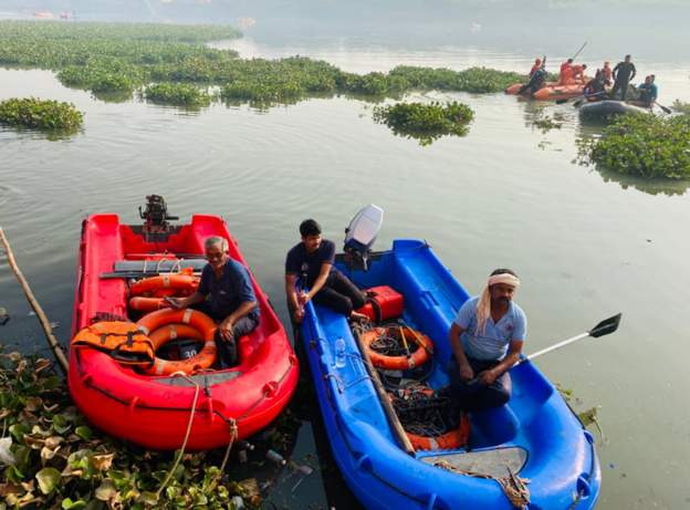Oficialii folosesc macarale pentru a scoate resturile de pe podul spart din râu, în timp ce salvatorii călătoresc cu bărci mici pentru a căuta mai mulți supraviețuitori.