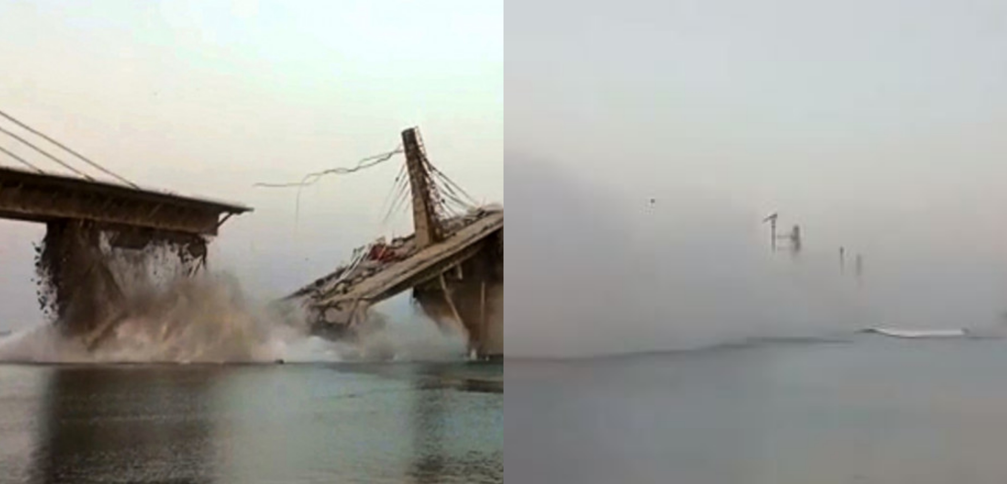 Imagini inedite cu un pod din India care se prăbușește. Structura abia fusese refăcută după ce mai căzuse o dată.