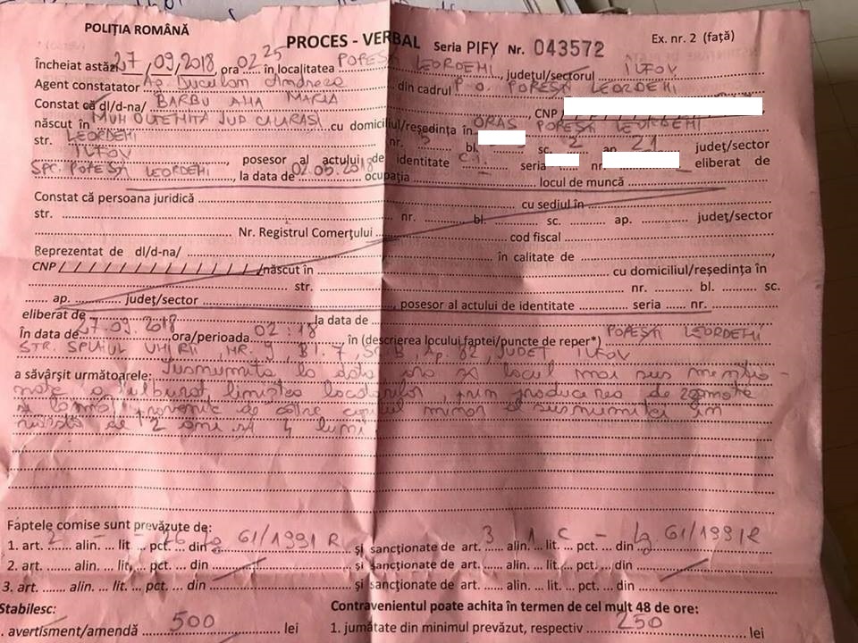 "Subsemnata, la ora si locul mai sus mentionate a tulburat linistea locatarilor prin producerea de zgomote provenite de catre copilul minor al subsemnatei in varsta de 2 ani si 4 luni", se arata in procesul verbal.