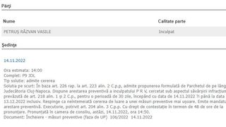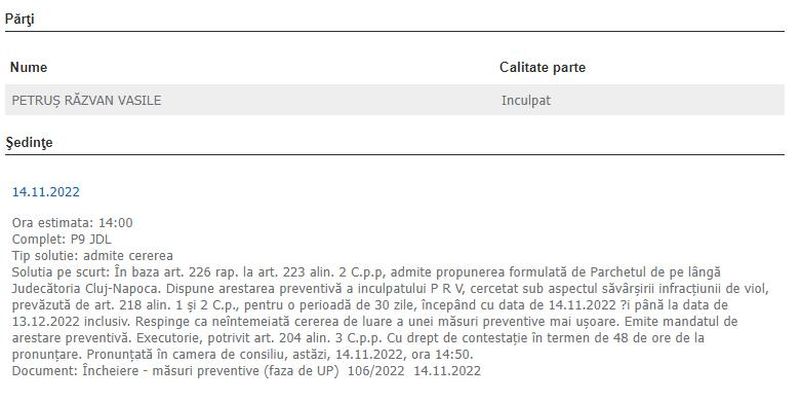Pe rolul Judecătoriei Cluj-Napoca apare o soluție de arestare preventivă, pentru viol, pe numele lui Petruș Răzvan Vasile, după cum arată ZiardeCluj.ro.