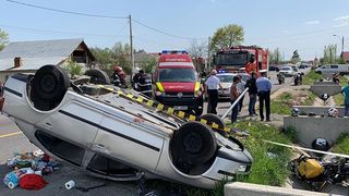 În urma impactului, maşina s-a răsturnat şi trei persoane sunt rănite. O feţiţă care este şi ea rănită grav, potrivit argesenii.ro.
