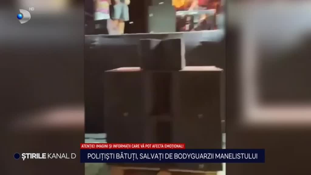 Bodyguarzii manelistului de pe scena intervin. Îi salvează pe polițiști și îl pun la pământ pe scandalagiu.
