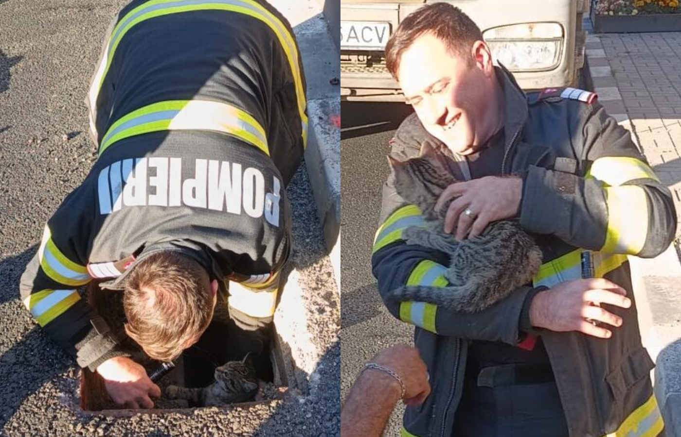 „Misiune reușită de salvare a unui animal de talie mică (pisică) din medii ostile vieții. Salvatorii vâlceni au reușit să extragă, cu ajutorul ADP și SVSU Vâlcea, o pisică captiva într-un cămin de colectare, care era blocat în urma procesului de asfaltare, în municipiul Râmnicu Vâlcea, strada Calea lui Traian. Pisică a fost extrasă de salvatorii vâlceni și este în stare foarte bună”, transmite ISU Vâlcea.