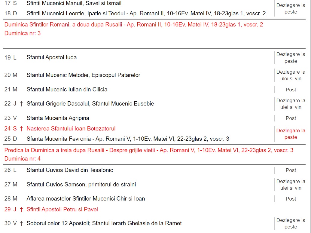 Astfel, potrivit crestinortodox.ro, creștinii pot consuma pește în zilele de 17 iunie, de Sfintii Mucenici Manuil, Savel si Ismail, 18 iunie, de Sfintii Mucenici Leontie, Ipatie si Teodul- Ap.