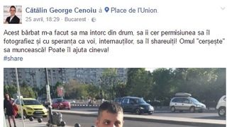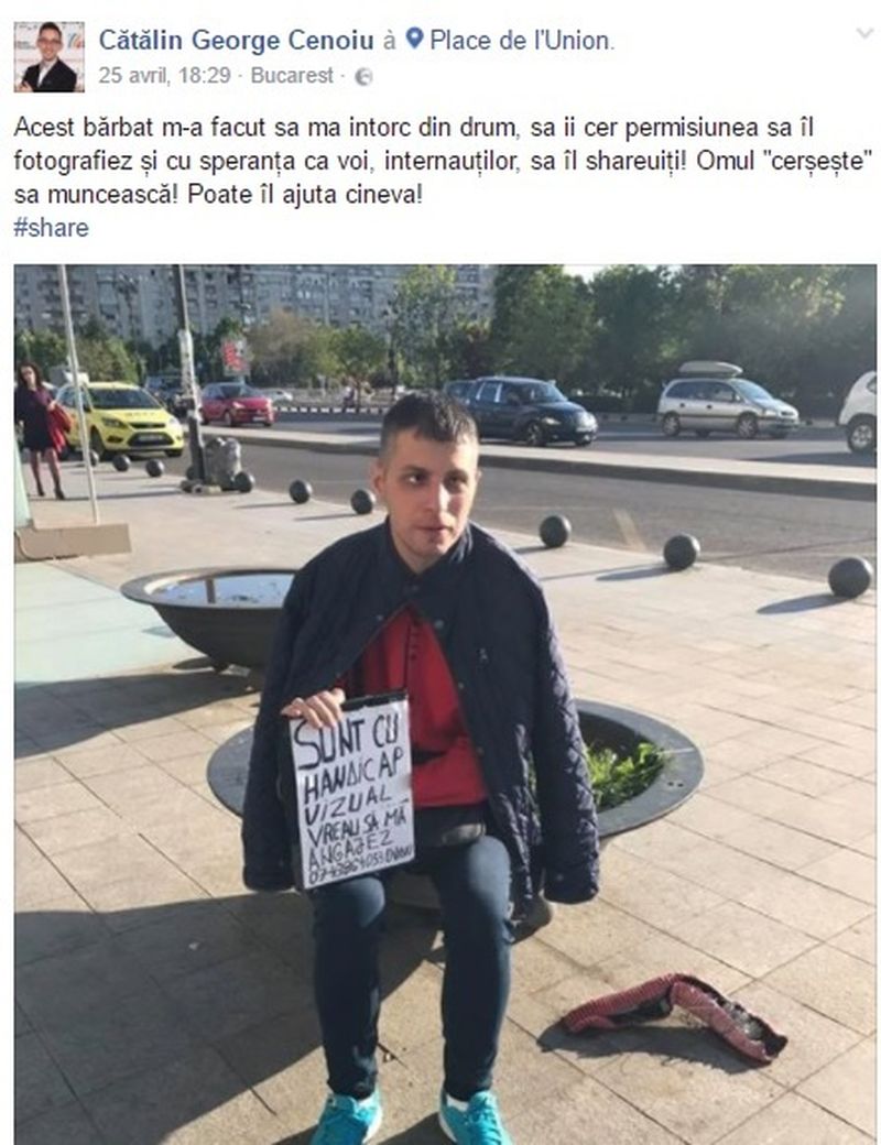 "Acest barbat m-a facut sa ma intorc din drum, sa ii cer permisiunea sa il fotografiez si cu speranta ca voi, internautilor, sa il shareuiti! Omul "cerseste" sa munceasca! Poate il ajuta cineva!", a fost prima postare a internautului.