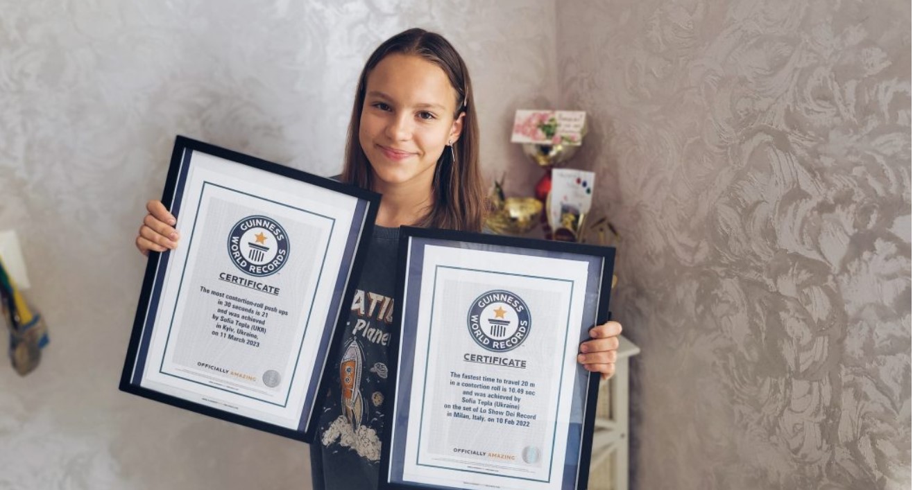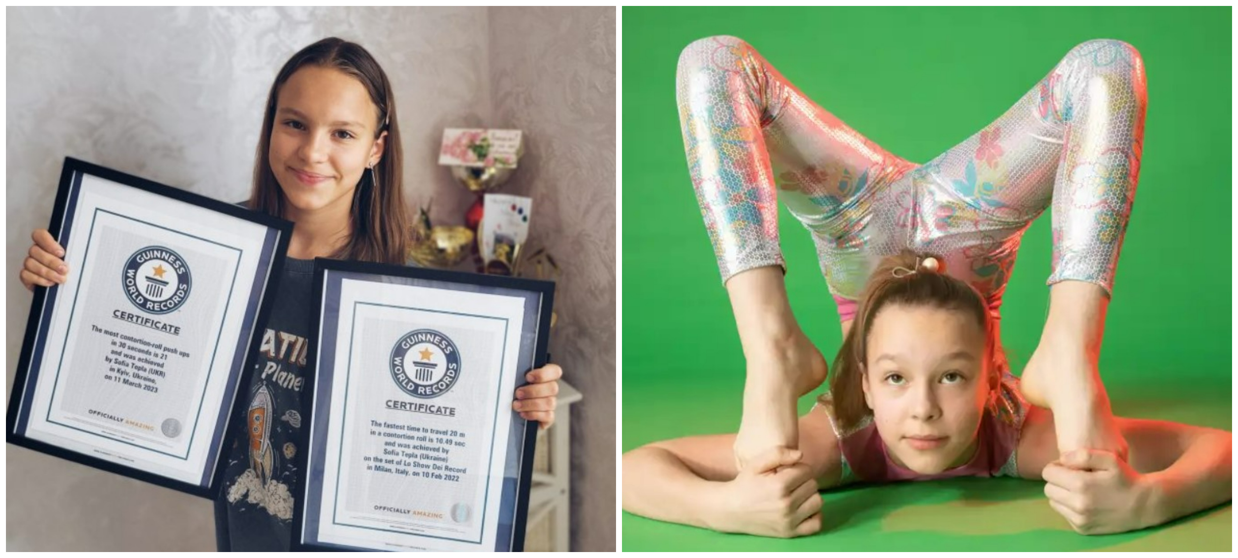 Sofia Tepla a realizat 21 de flotări contorsionate pe 11 martie, în Ucraina, la vârsta de doar 12 ani. Copila, acum în vârstă de 13 ani, a obținut, un loc în capitolul „tinerilor” din viitoarea carte GWR 2024 pentru o altă cascadorie impresionantă de contorsionism.