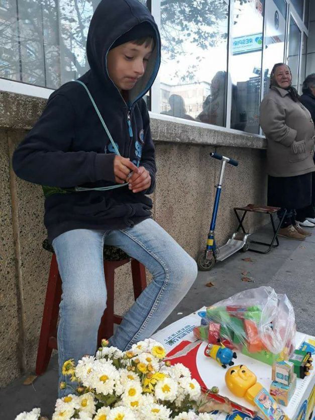 Un baiat, de numai 10 ani, a fost fotografiat intr-un gang din Mioveni in timp ce isi vindea jucariile ca sa faca rost de bani pentru a-si cumpara haine de iarna.