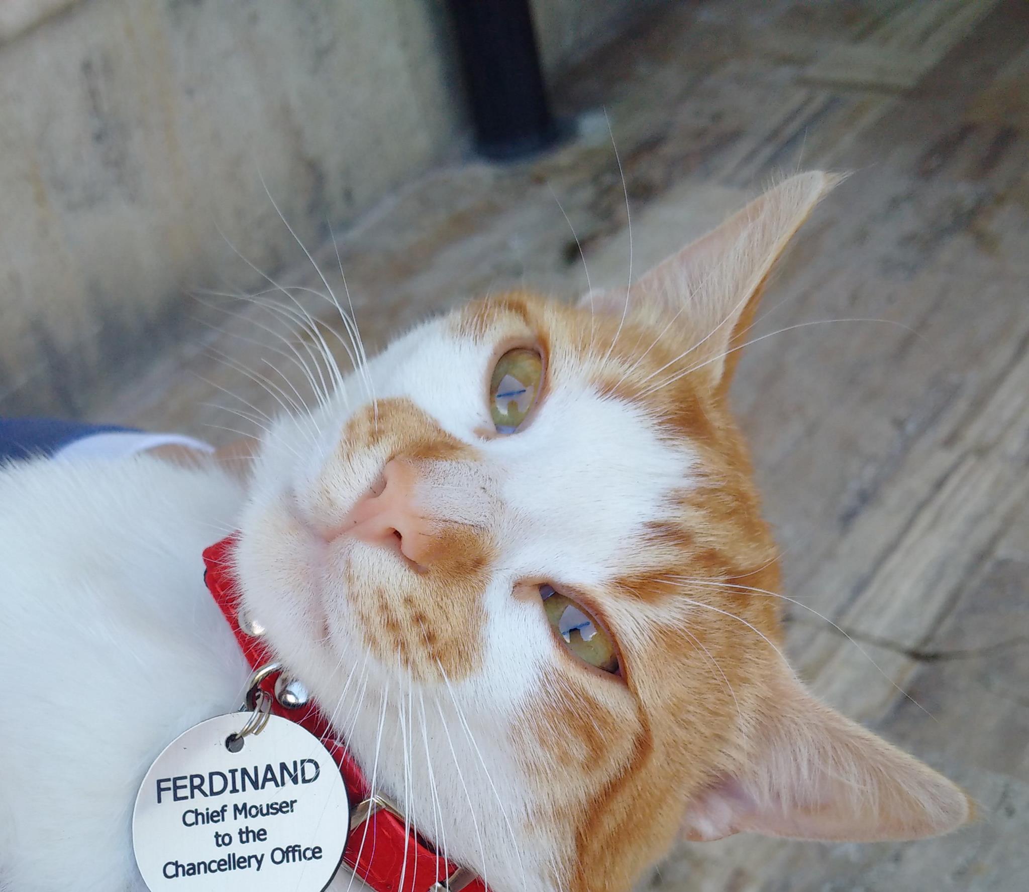 Motanul Ferdinand este un personaj important la Cotroceni, are propriul sau loc si un medalion cu numele sau si titulatura “ Ferdinand- Chief Mouser to the Chancellery Office”. Ei bine, de ceva timp, la Cotroceni a aparut si o pisica, iar intre cele doua feline s-a infiripat o idila, pe care angajatii o protejeaza cu atentie. Pisica isi face acum veacul prin birourile de la Palat. Cristina Verona Tobi, directorul Muzeului Cotroceni, cu Ferdinand, in gradina Palatului