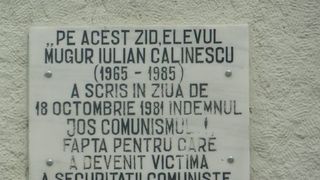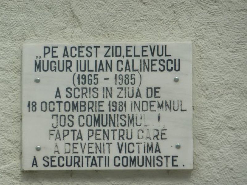 Mugur Calinescu s-a nascut pe 28 mai 1965 si a incetat din viata pe 14 februarie 1985, ca urmare a torturilor la care a fost supus de Securitate. Elev la liceul "A.T. Laurian" din Botosani, Mugur si-a inceput lupta impotriva sistemului comunist in clasa a XI-lea, cand in nopatea de 12 spre 13 septembrie 1981 a scris cu creta, pe peretele Comitetului Judetean PCR din localitate, diverse indemnuri de lupta impotriva regimului Ceausescu.