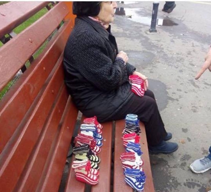 Povestea acestei femei a fost impartasita de un utilizator Facebook. Batranica din imagine nu cerseste, ci isi vinde produsele. Mai exact, botosei facuti manual pentru bebelusi.