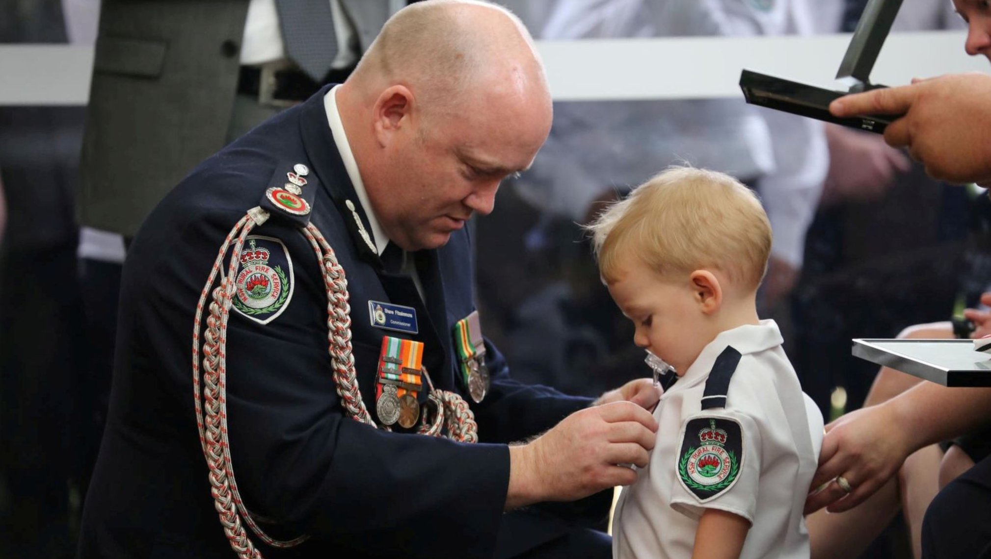 1 din 3 | Povestea impresionantă a unui copil de doi ani. A fost decorat în locul tatălui său, un pompier ucis de flăcările din Australia