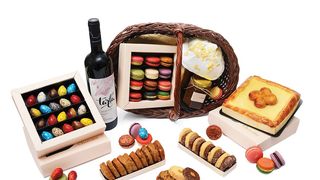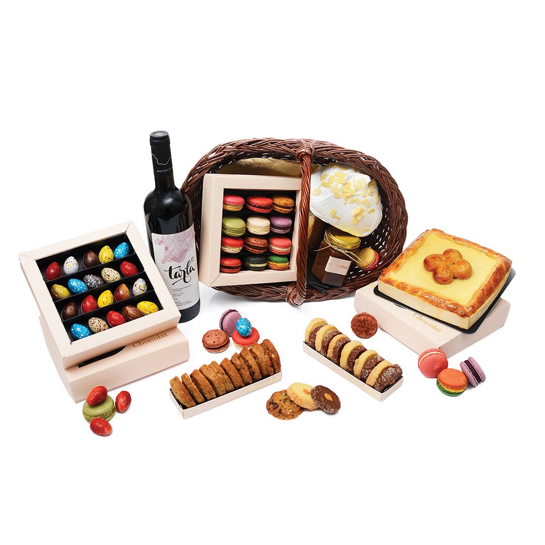 Iar daca vrei sa oferi cuiva drag un cadou pentru Paste, iti recomandam Cosuletul cu bunatati (bineinteles, il poti comanda si pentru tine). Acesta contine o selectie de produse marca Chocolat, printre care o Pasca, praline, macarons, mini-cookies, bezea traditionala, biscuiti, o sticla de vin rosu Tarla si un borcane cu crema de ciocolata.