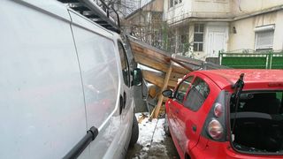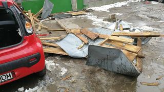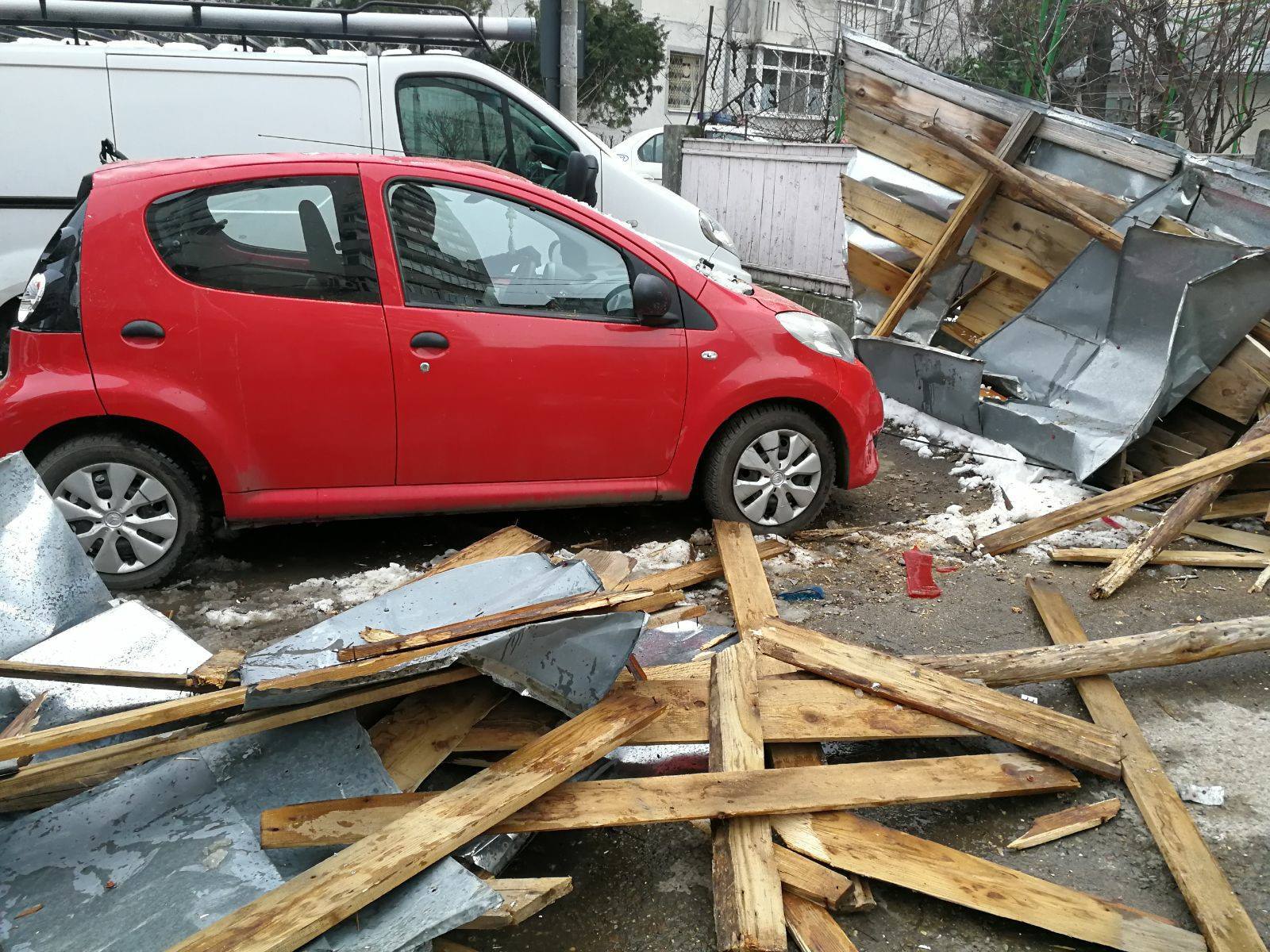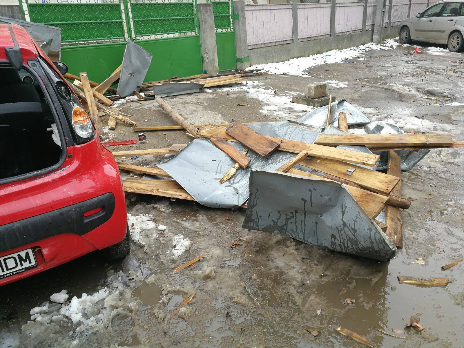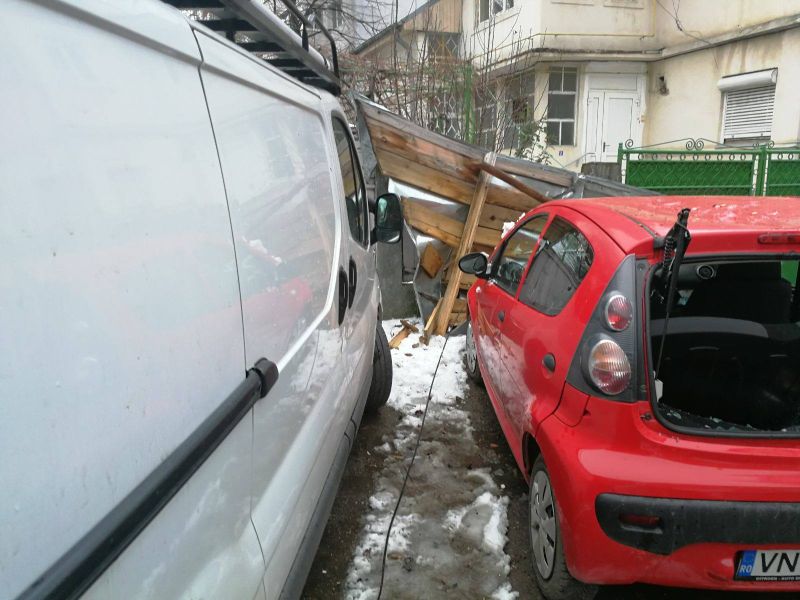 Bucati de acoperis de pe un bloc din Focsani au fost smulse de vantul puternic, cazand peste doua autoturisme care au fost avariate.