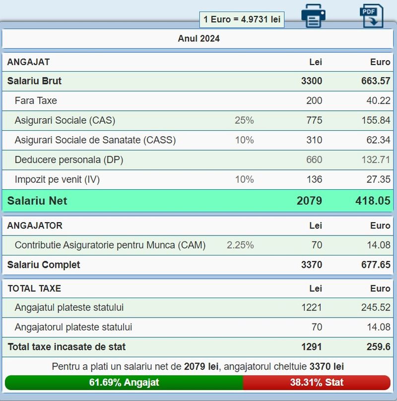 În privința salariului minim brut, acesta este în prezent de 3.300 lei (660 euro).