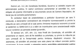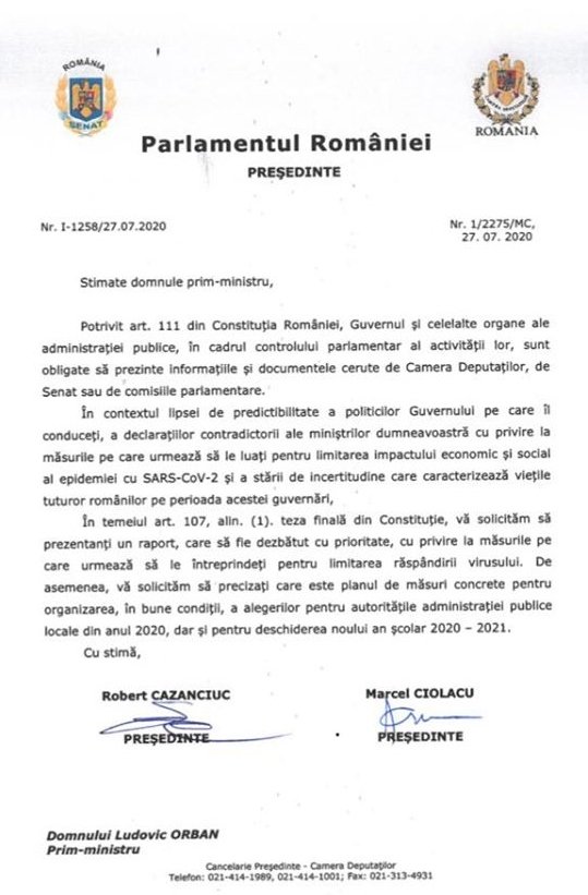 Marcel Ciolacu, preşedintele Camerei Deputaţilor, şi Robert Cazanciuc, preşedintele interimar al Senatului, i-au trimis luni premierului Orban o scrisoare în care șeful Executivului este chemat în faţa Parlamentului.
