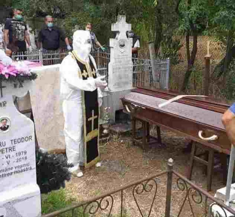 Totul s-a întâmplat vineri, la înmormântarea unui localnic de 73 de ani, care a murit joi la Spitalul Caracal, fiind infectat și cu COVID-19. Acesta a fost îngropat în comuna Teslui, la slujba de la groapă preotul Alexandru Militaru venind echipat cu acest costum de protecție, peste care avea patrafirul. Sicriul cu bărbatul mort a fost transportat de la Spitalul Municipal Caracal direct la cimitir, acesta fiind sigilat, notează sursa citată.