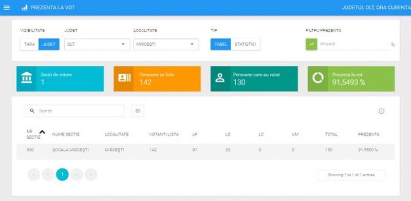 In localitatea Mircesti din judetul Olt, prezenta la vot pana la ora 12 era de 90%. Aici sunt inregistrate 142 de persoane pe lista dintre care au votat 97, lor li s-au alaturat 32 de persoane pe listele suplimentare, reiese din datele publicate pe site-ul celor de la Biroul Electoral Central.