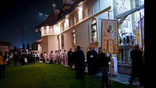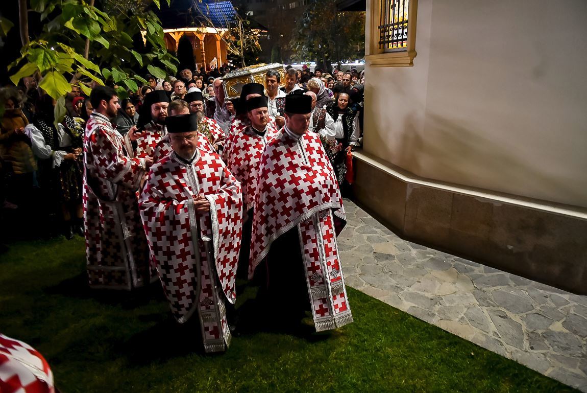 Luni seară, a avut loc prima procesiune, în jurul Paraclisului Catedralei Naţionale, iar moaştele Sfântului Ioan Gură de Aur au fost purtate de preoţi şi apoi aşezate într-un baldachin special amenajat în curtea lăcaşului de cult.