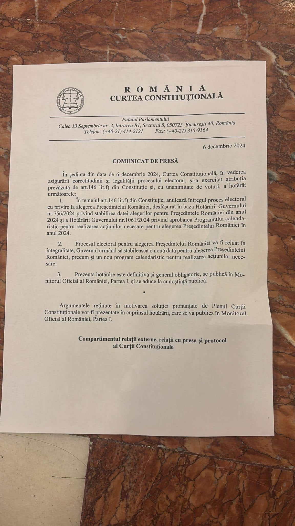 CCR a decis anularea alegerilor prezidențiale. Comunicatul transmis de Curtea Constituțională a României: