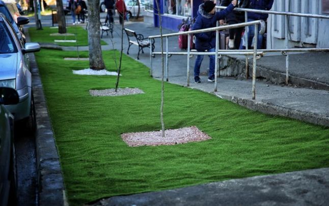 Primăria Bacău "a plantat" mochetă în loc de iarbă în oraş: "Nu trebuie udat, nu are nevoie de îngrigire specială"
