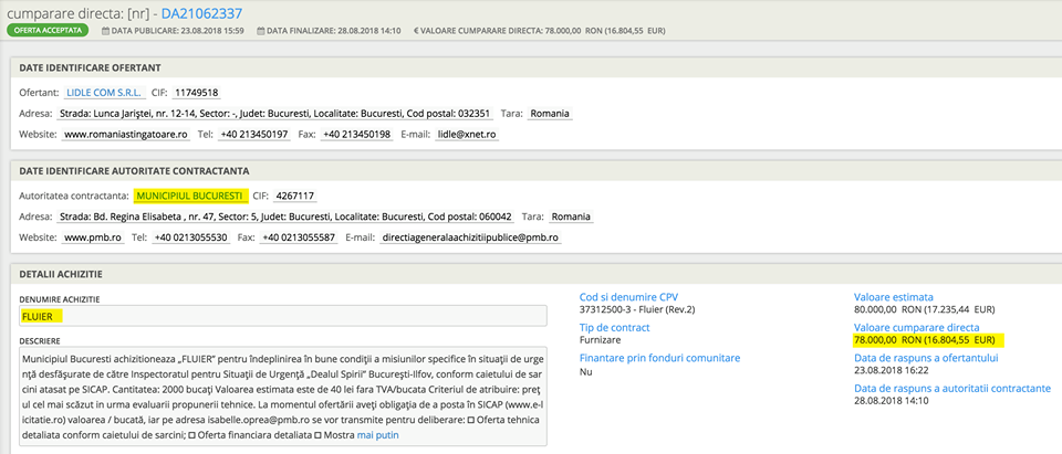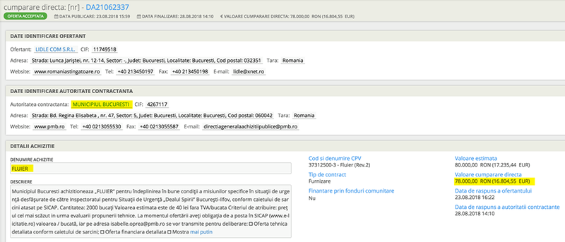 „V-ati intrebat ce cumparaturi a mai facut dna Firea din banii nostri? Va spun eu: FLUIERE. Primaria Municipiului Bucuresti a cumparat 2000 de ''fluiere cu bila'' in valoare de 78.000 RON (16.804 Euro), fara TVA. Da, ati auzit bine. Prioritati pentru autoritati”, se arata in postarea consilierului USR.