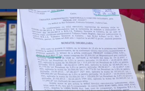 Somațiile de executare silită vin una după alta la primăria din Golăiești. Până acum au ajuns 30 de înștiințări prin care autoritățile locale sunt informate că li se va pune sechestru pe aproape tot ce ar putea fi vândut pentru recuperarea sumelor neplătite.