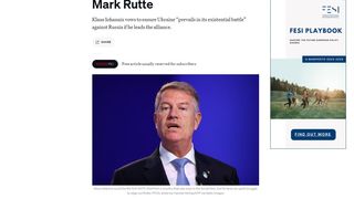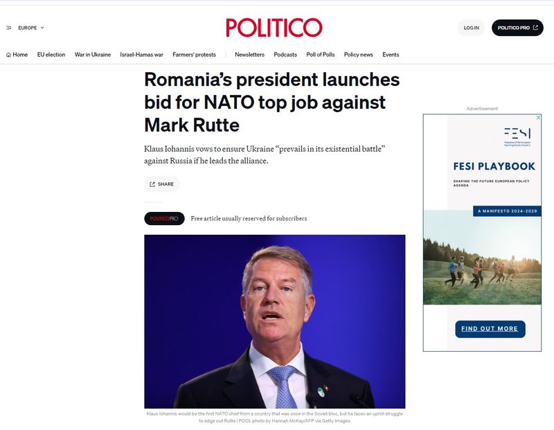Și publicația Politico.eu tratează pe larg anunțul prin care președintele României își lansează candidatura pentru un "job de top în NATO" împotriva lui Mark Rutte.
