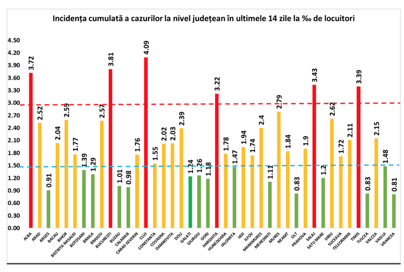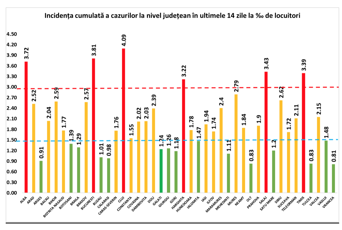 Judeţul Cluj a înregistrat cea mai mare incidenţă cumulată a cazurilor de infectare cu noul coronavirus, calculată în ultimele 14 zile, de 4,09 la mia de locuitori, potrivit bilanțului transmis, miercuri 24 octombrie, de Grupul de Comunicare Strategică (GCS).