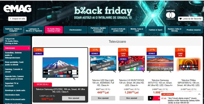 Retailerul online eMag a dat startul reducerilor de Black Friday 2020 înainte de ora 7,40 dimineața, iar primul produs epuizat a fost un televizor smart ultra HD