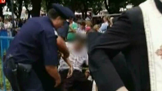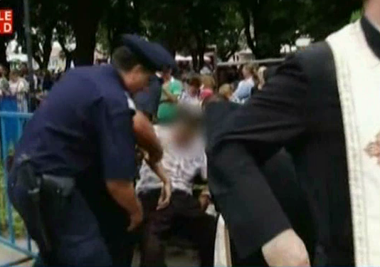 Istovit dupa ore bune de stat in picioare, bietul batran s-a prabusit in mijlocul multimii. Patru jandarmi l-au scos pe brate.