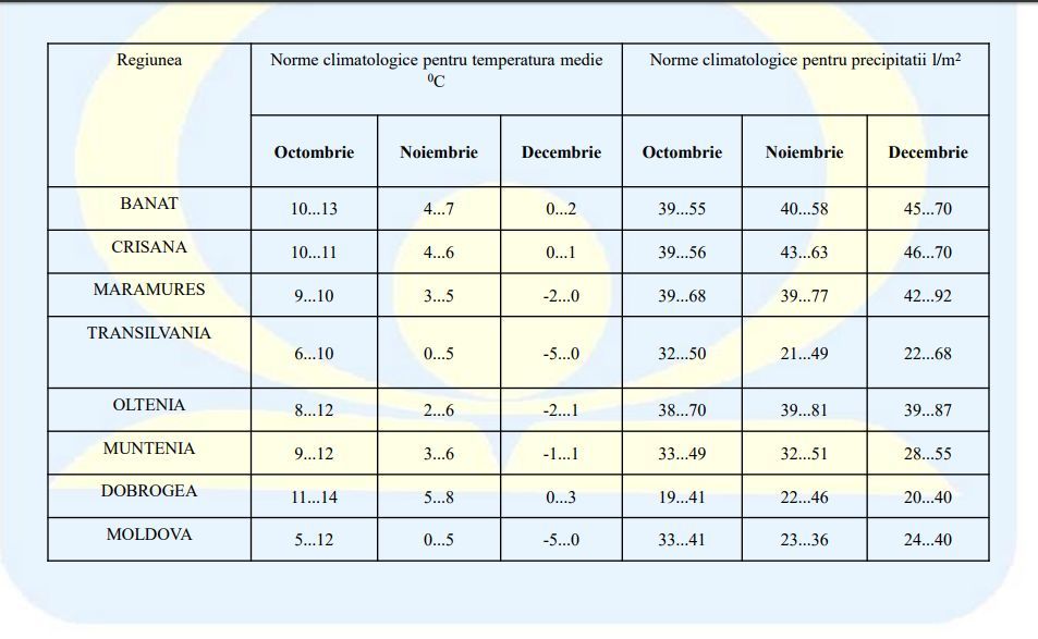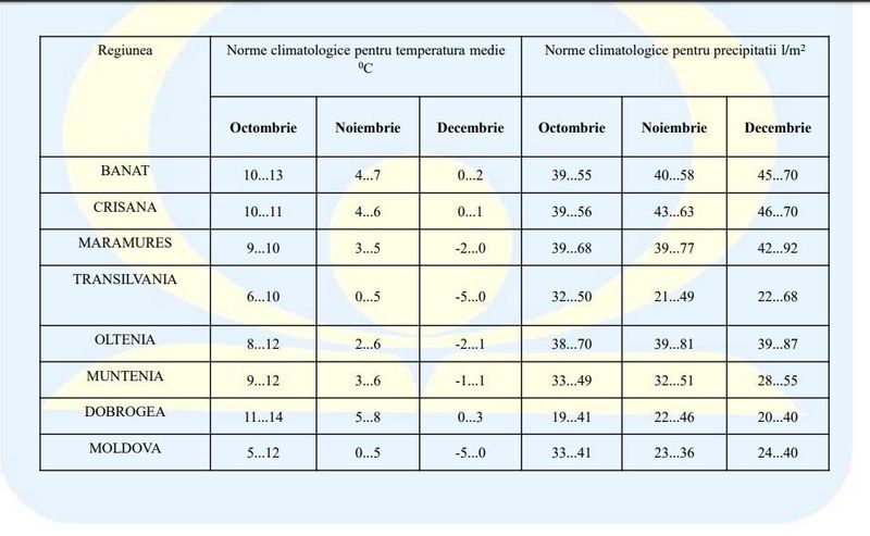 Prognoza meteo pe trei luni, pentru intervalul octombrie – decembrie, emisa de Administratia Nationala de Meteorologie (ANM), indica temperaturi peste medie in sudul si vestul tarii, in special in urmatoarele doua luni. In ceea ce priveste precipitatiile, acestea vor avea tendinte excedentare in unele zone, mai ales in decembrie, cand acestea s-ar putea transforma si in lapovita sau ninsoare, aparitia acestor fenomene fiind favorizata si de temperaturile scazute aferente ultimei luni ale anului.