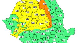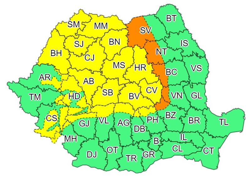 1 din 2 | Codul portocaliu va fi în vigoare între orele 12:00 - 21:00 şi va viza zonele de munte ale judeţelor: Suceava, Neamţ, Bacău, Vrancea şi Buzău.