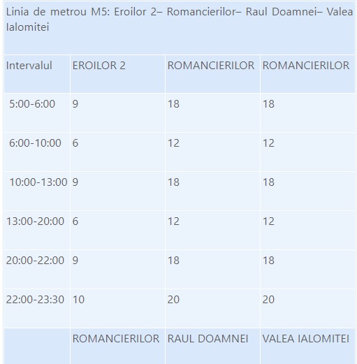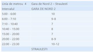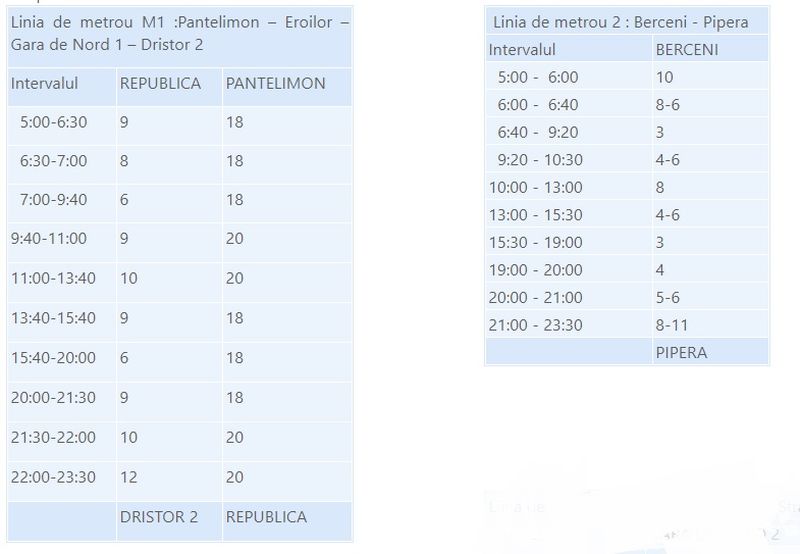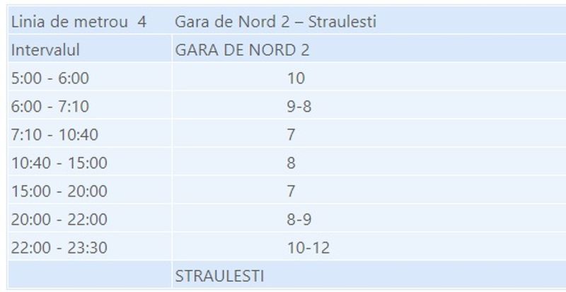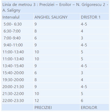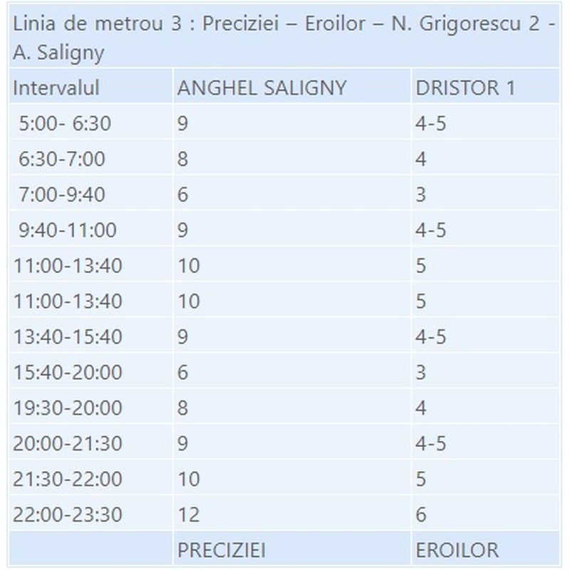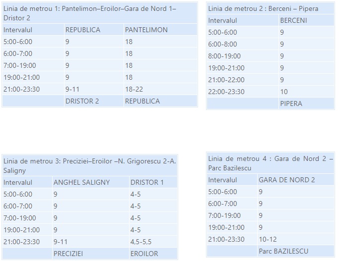 Începând cu 15 septembrie 2020 intervalele de circulație ale trenurilor de metrou sunt următoarele: