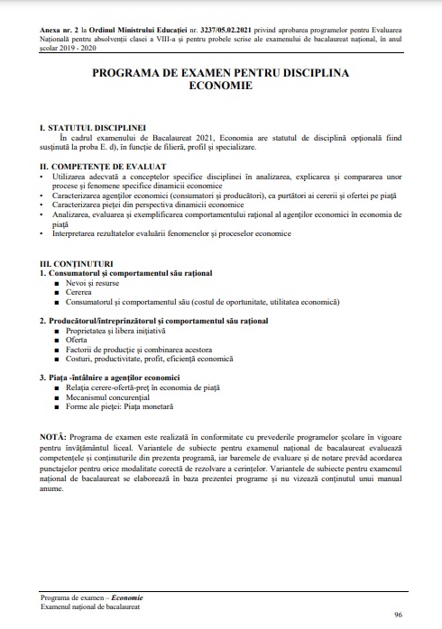 Programa pentru Bacalaureat la disciplina Economie este realizată în conformitate cu prevederile programei școlare pentru învățământul liceal. Modelele și subiectele pentru examenul de Bacalaureat prevăd evaluarea competențelor și a conținuturilor din prezenta programă. Baremele de evaluare și de notare prevăd acordarea punctajelor pentru rezolvarea corectă a cerințelor de examen.