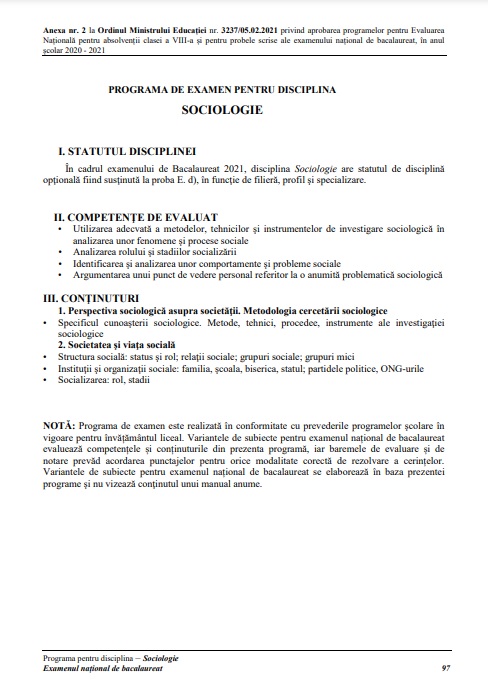 Programa pentru Bacalaureat la disciplina Sociologie este realizată în conformitate cu prevederile programei școlare pentru învățământul liceal. Modelele și subiectele pentru examenul de Bacalaureat prevăd evaluarea competențelor și a conținuturilor din prezenta programă. Baremele de evaluare și de notare prevăd acordarea punctajelor pentru rezolvarea corectă a cerințelor de examen.