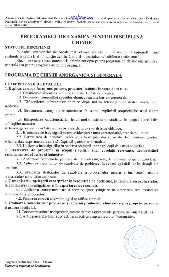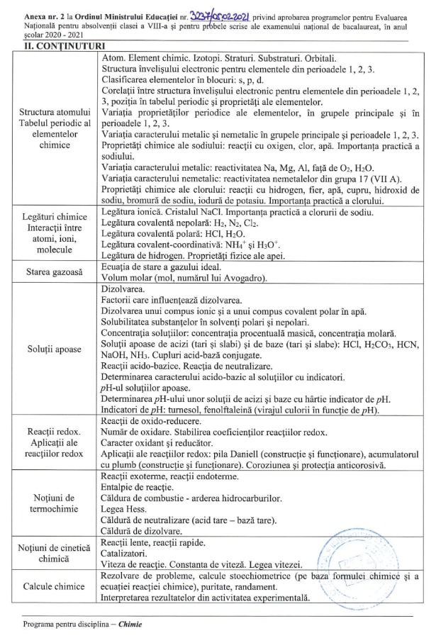 Programa pentru Bacalaureat 2021 la Chimie a fost publicată în Monitorul Oficial pentru examenele scrise de anul acesta. Astfel, Ministerul Educației va realiza subiectele de examen pe baza acestui document.
