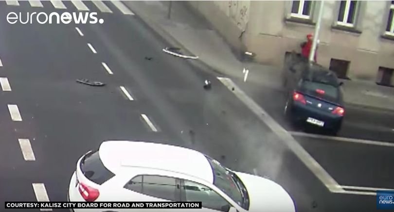 Accidentul a avut loc intr-o localitate din Polonia. Femeia a fost salvata, la propriu, de un stalp. Daca nu era stalpul, urma sa fie strivita de o masina, implicata intr-un accident rutier. Din fericire, nimeni nu a suferit rani in urma accidentului.