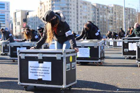 Lucrători din industria spectacolelor protestează sâmbătă, în Piaţa Victoriei, în cadrul campaniei #NuSuntemInvizibili, solicitând Guvernului măsuri compensatorii pentru pierderile financiare din ultimii doi ani.