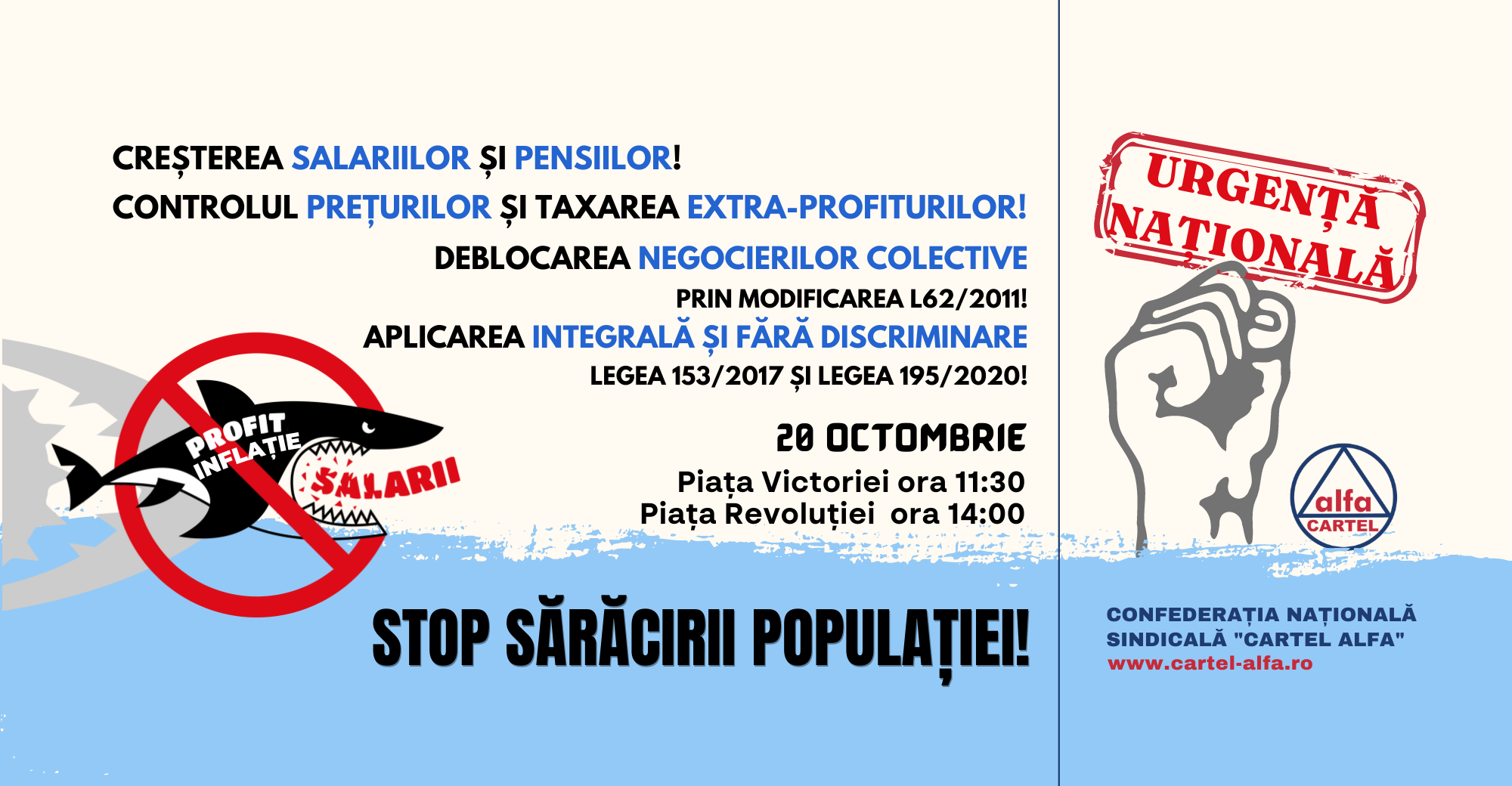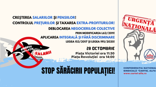 Sindicaliştii cer controlul preţurilor şi taxarea extra-profiturilor, creşterea salariilor şi a pensiilor, deblocarea negocierilor colective (modificarea Legii dialogului social) şi aplicarea integral şi fără discriminare a Legii 153/2017, privind salarizarea personalului plătit din fonduri