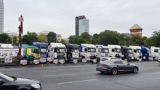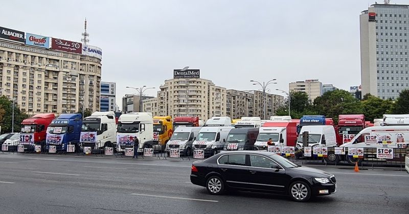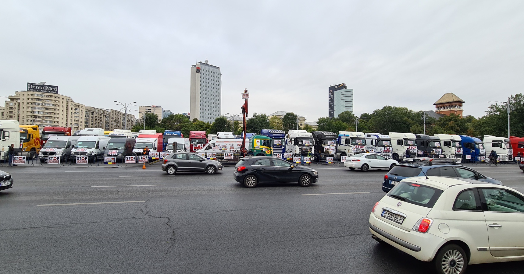 Câteva zeci de camioane aparţinând a trei asociaţii patronale ale transportatorilor rutieri sunt parcate, miercuri dimineaţă, în Piaţa Victoriei, în cadrul unui miting de protest al transportatorilor faţă de politica Guvernului de impozitare a diurnei şoferilor de transport de marfă, dar şi faţă de preţurile asigurărilor obligatorii auto şi de carantinarea şoferilor.