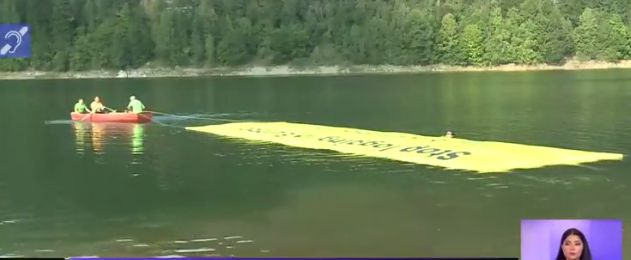 Ecologistii au intins pe luciul apei un bannerul de 15 metri si l-au plimbat cu o barcă pe lacul Vidraru.
