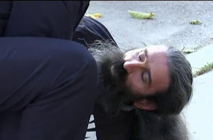 Nici imobilizat, barbatul nu inceteaza sa protesteze!