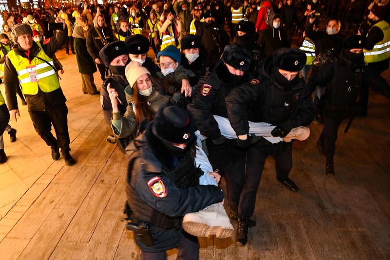 Sute de protestatari au fost arestaţi, joi seara, lângă Piaţa Puşkin din capitala rusă şi alţi circa 20 în al doilea oraş al Rusiei, în timp ce scandau „Nu războiului!”, relatează sursa citată.