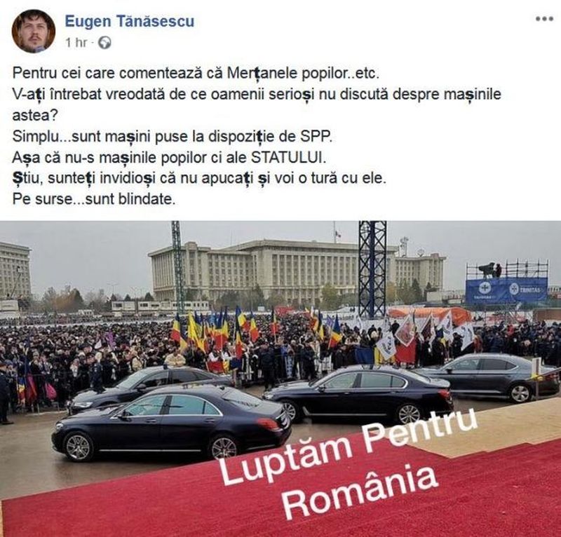 „Pentru cei care comentează că Merţanele popilor... etc. V-aţi întrebat vreodată de ce oamenii serioşi nu discută despre maşinile astea? Simplu... sunt maşini puse la dispoziţie de SPP. Aşa că nu-s maşinile popilor, ci ale STATULUI. Ştiu, sunteţi invidioşi că nu apucaţi şi voi o tură cu ele. Pe surse... sunt blindate.“