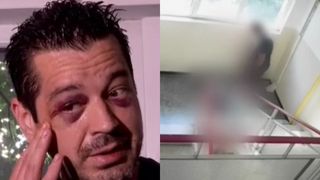 El este Sergiu, bărbatul de 44 de ani, aproape omorât de vecinul său. Cu fața vânătă, ochii însângerați și bărbia plină de copci, acesta abia reușește să-și stăpânească emoțiile în timp ce povestește clipele de groază prin care a trecut. Camera de supraveghere din bloc a surprins incidentul cutremurător în care agresorul își aruncă vecinul de la etajul patru pe scări.