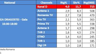 Duminică, 24 ianuarie, în intervalul orar menționat mai sus, Kanal D a fost lider de piață, cu 4,0% rating și 11,7% cota de piață, pe targetul Național, și 2,9% rating și 9,1% cota de piață, pe targetul all Urban.