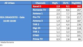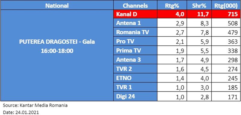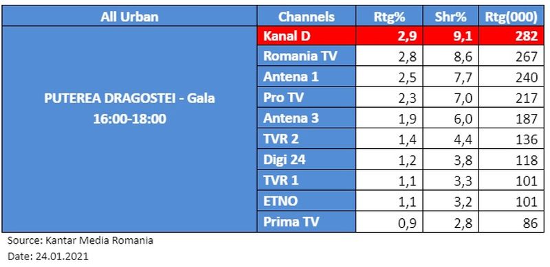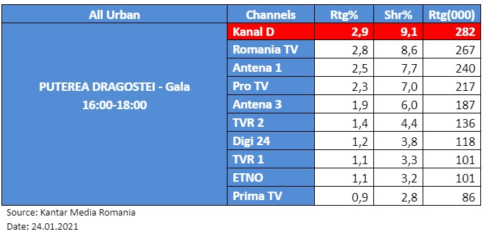 Gala de duminică a emisiunii “Puterea Dragostei”, prezentată de Cristina Mihaela Dorobanțu, a plasat Kanal D pe primul loc în topul televiziunilor din România, atât la nivelul întregii țări, cât și în rândul populației de la orașe.