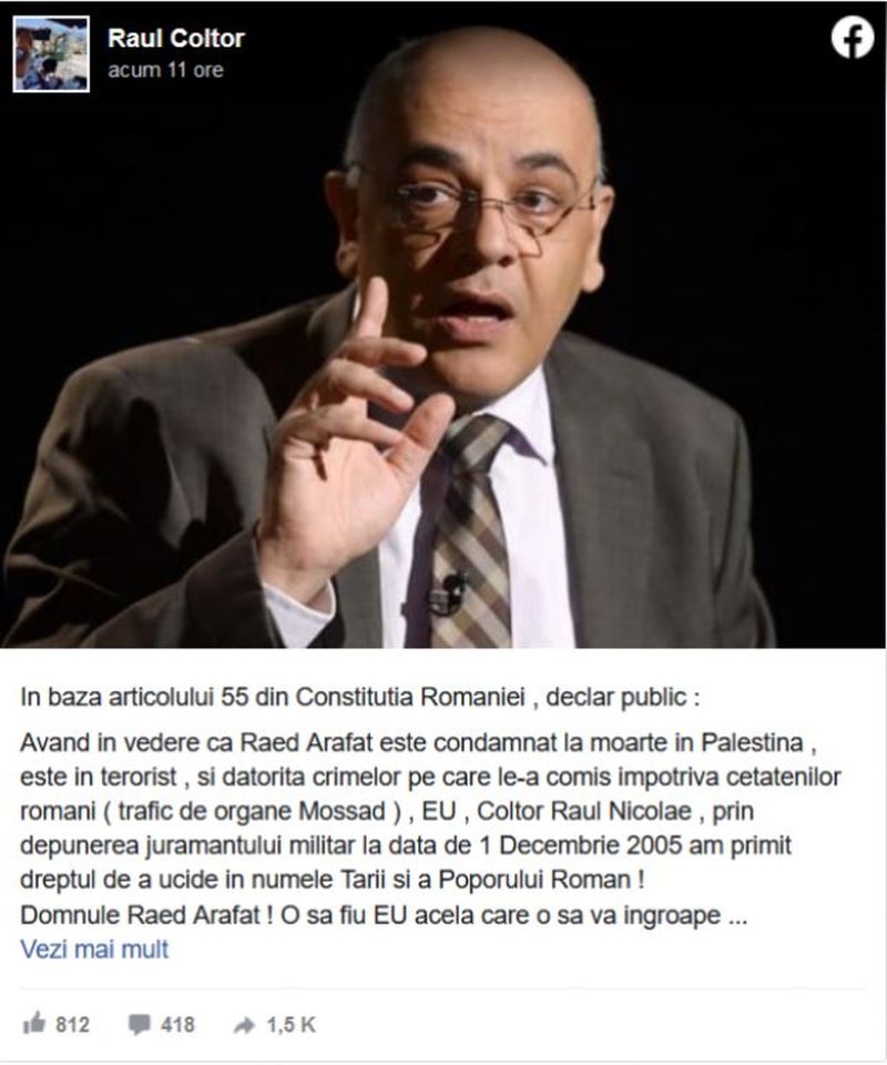 „În baza articolului 55 din Constituţia României, declar public: Având în vedere că Raed Arafat este condamnat la moarte în Palestina şi datorită crimelor pe care le-a comis împotriva cetăţenilor români( trafic de organe Mossad), EU, Coltor Raul Nicolae, prin depunerea jurământului militar la data de 1 Decembrie 2005 am primit dreptul de a ucide în numele Ţării şi a Poporului Român! Domnule Raed Arafat! O să fiu EU acela care o sa va ingroape alături de un porc (animal considerat impur în religia musulmană, n.r.)